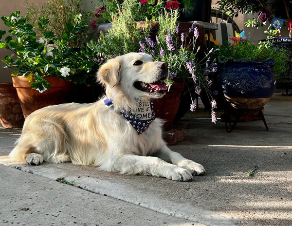 A year later, she has grown into a beautiful golden girl. She loves being outdoors, chasing quail from our yard, or watching the golfers behind our home. She’s become best friends with many dogs and people in our neighborhood. She particularly loves one neighbor who welcomes her with a biscuit.